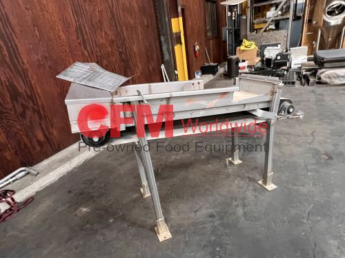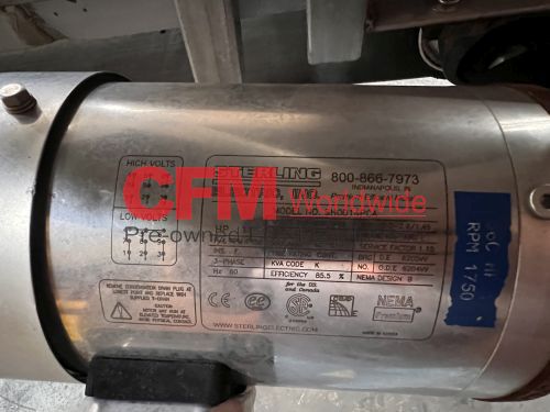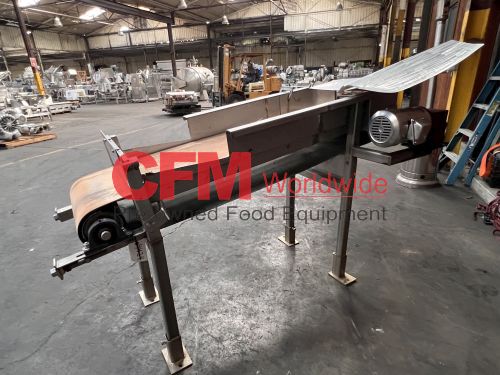 18" wide x 66" long sanitary rubber belt conveyor, 32" high infeed, 40" high discharge, 1hp stainless steel gearhead direct drive, 230/460/3/60, as is – good condition.