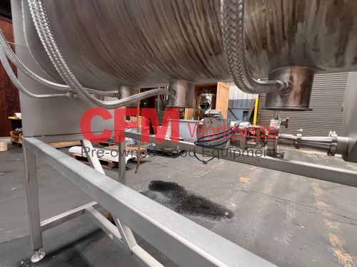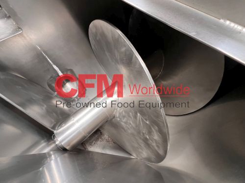 24" diameter x 6' long Rietz style steam injected hot water blancher/cooler, all stainless steel contact and frame construction, open top infeed, with hinged cover, side paddle discharge with dewatering screen, set up with (4) stainless steel infusers with manifold, driven by a 1/2hp gearhead chain drive with guard, 230/460/3/60, set up with a Fristam 2" x 1.5" stainless steel centrifugal pump for recirculating screened water, as is - very good condition.