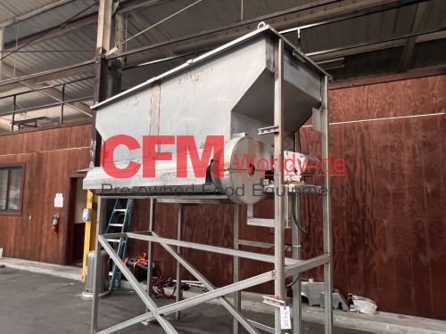 32" wide x 8' long x 32" deep stainless steel feed hopper with a 12" diameter x 6' long rotary metering valve, with catwalk, with a 2hp gearhead chain drive, 9' high infeed , 6' high discharge, as is – good condition.