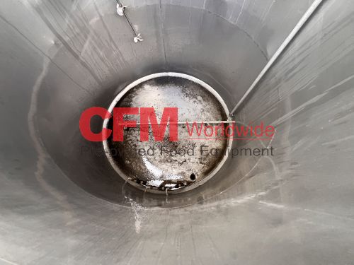 400 gallon stainless steel vertical tank, 48" diameter x 50" tall, hinged cover, flat bottom, 2" bottom discharge, mild steel legs, with a broken Lightnin' mixer, as is, fair condition.