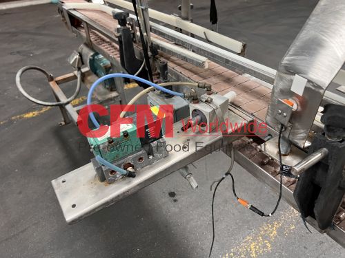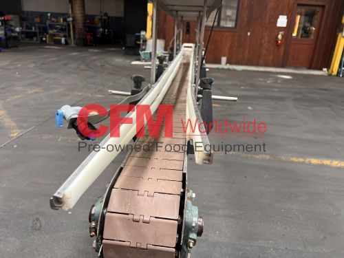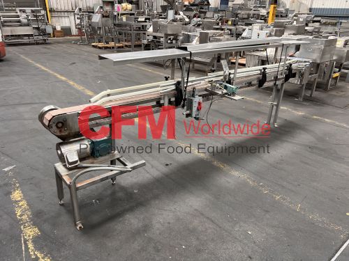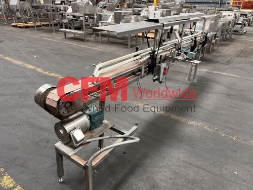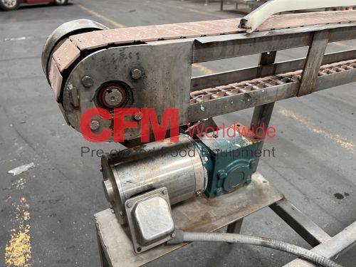 4.5" wide x 11' long stainless steel table top conveyor, plastic belting, 3/4hp gearhead chain drive, belting with top mounted hood, as is – fair to good condition.