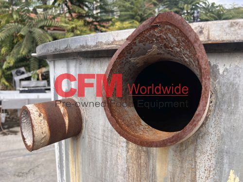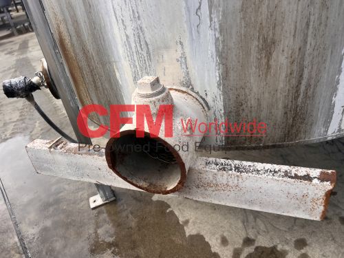 500 gallon stainless steel vertical tank, 60" diameter x 48" tall, with lid, 4) 6" mild steel infeeds, 2) 2" infeeds, 1) 3" infeed, 3" center bottom discharge, stainless steel legs, tank has a lot of scale built up, as is – fair condition.