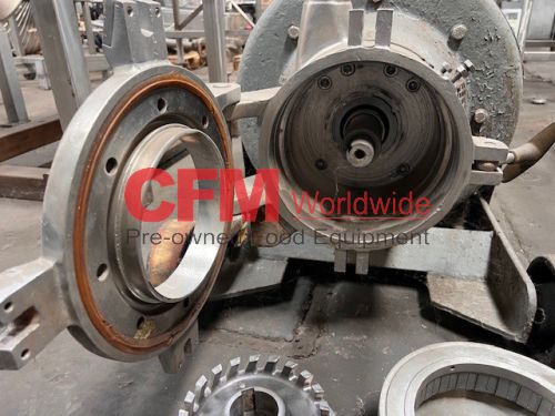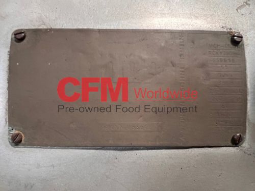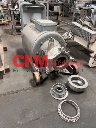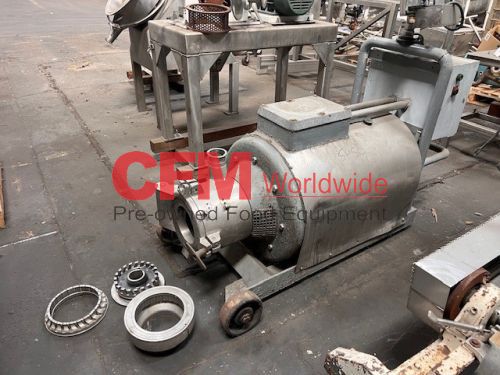 Stephan model MCH-D100A emulsifier with twin MicroCut head, 8" inlet, 3" Tri-Clamp discharge, serial number 279816, motor number RDXY280S-2, with cutting head, 75 HP electric motor drive, 3565 RPM, wired 220/440/3/60 direct drive, all stainless steel contact, painted steel frame on wheels, feed hopper pictured is not available.