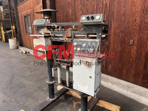 Bear horizontal roll through labeler for 300x407 cans, left to right can feed, with standard hot pot and old style paste assembly, continuous feed label bed, with drive and controls, unit requires a full rebuild, serial number BR-300E-017, as is.