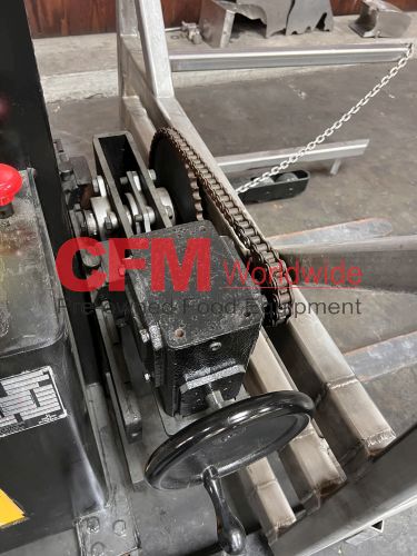 Big Lift "Big Joe" model S22-62 fully powered straddle stacker with full tote side tilt capabilities, 2200 pound capacity, 62" maximum lift, hand operated tilt with a 46" wide stainless steel tote support frame, 42" long forks on 20" fixed center, with (2)12v / E0583 batteries, serial number 4281902601, will not start – batteries may need replacing, as is, good condition.