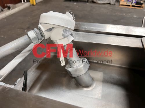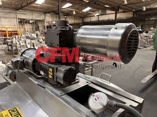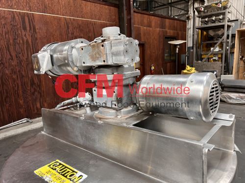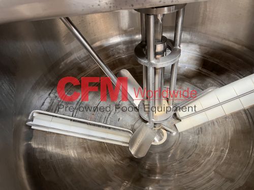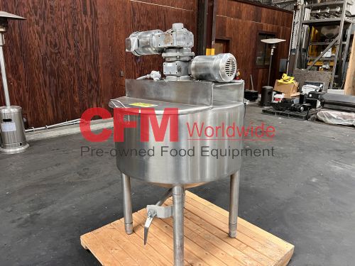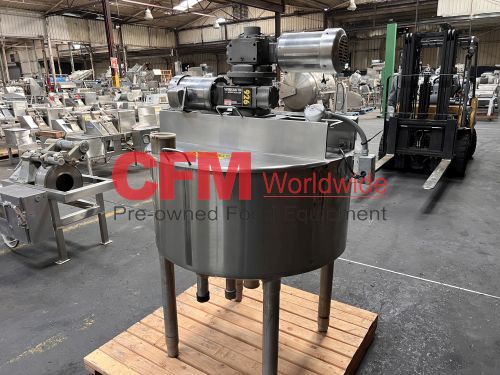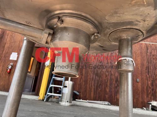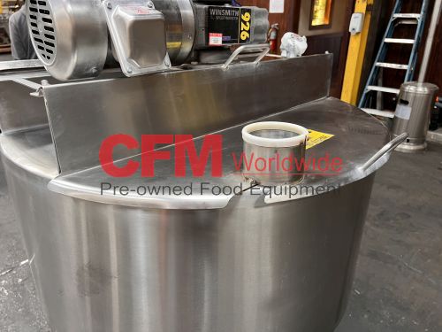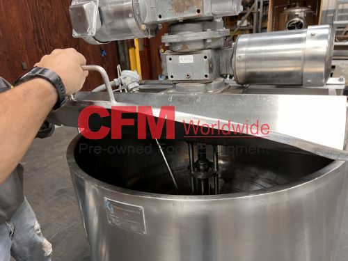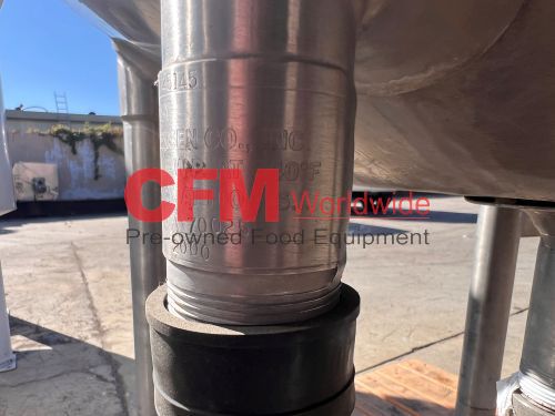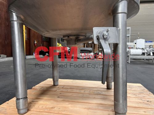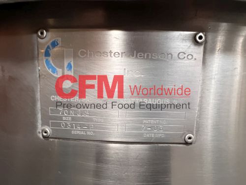 Chester-Jensen 70 gallon double motion swept surface cooker-cooler (kettle), model 70N2.5, 100psi jacket, 36" diameter x 16" tall with a 6" tall cone bottom, hinged covers, water jacketed, single motion swept surface agitation driven by dual 1hp stainless steel drive motors, 230/460/3/60, 3" center bottom discharge with a manual ball valve discharge, all stainless steel contact, bridge and frame construction, serial numbers 70025 and 0314-P, 2003, National Board Number 25145, as is, very good condition.