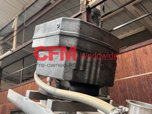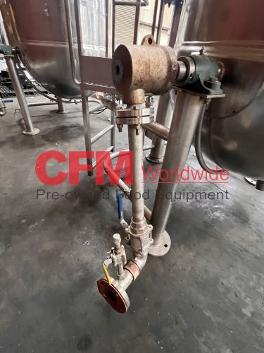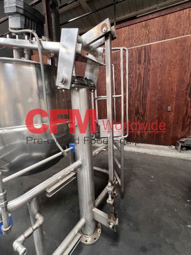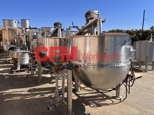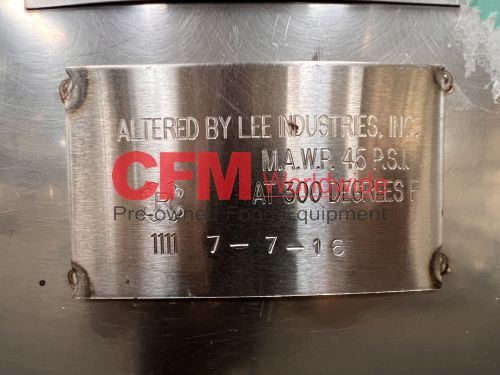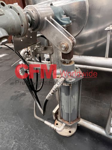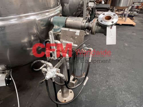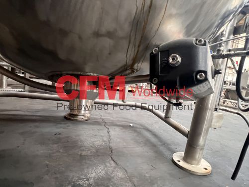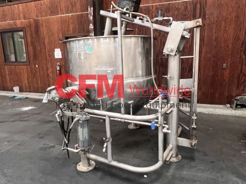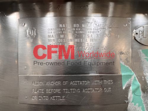 Groen 250 gallon single motion swept surface kettle, model D/INA/2/TA-250, 45PSI steam jacket, angle mounted agitation with gearhead drive (requires motor), requires the hydraulic cylinder for agitation tilt out, kettle has a hydraulic cylinder for tilting and has Deublin steam joints, 4"center bottom discharge with a Flowserve ball valve, unit includes an operator platform, all stainless steel contact, bridge and frame construction, with hydraulic controls, serial number 02600-2, National Board Number 140224, manufactured in 1999 and altered by Groen in 2016, as is, good condition.
