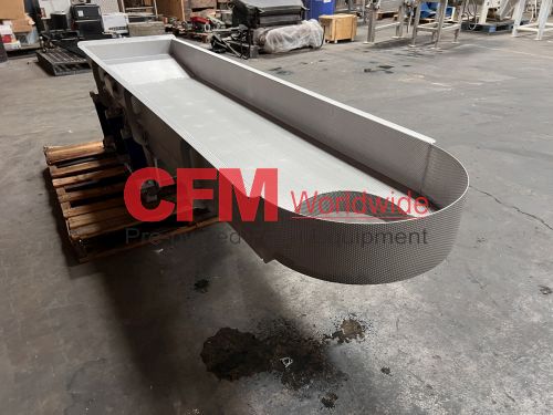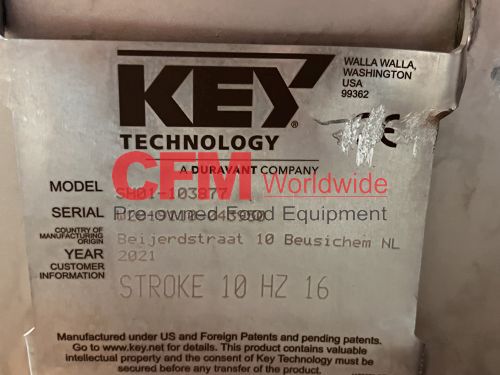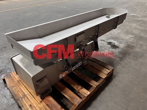Key 20" wide x 88" long vibratory scale feeder with a 12" diameter circular discharge, 6" sides, rigidized surfaces, powered by a Reo Reovib AC magnet vibrator, model WI 421/16/11.00, 230v, all stainless steel construction, model SH01-103877, serial number W2019110-43950, 2021, as I – very good condition.