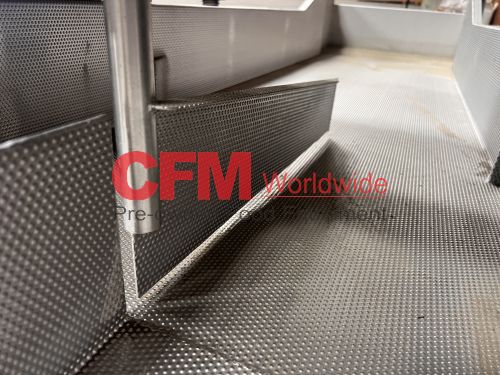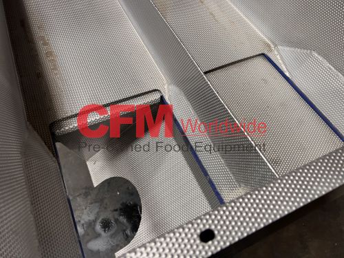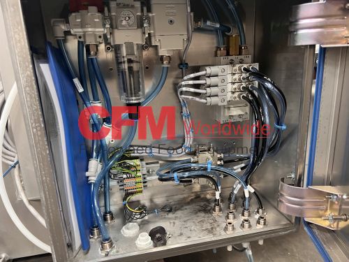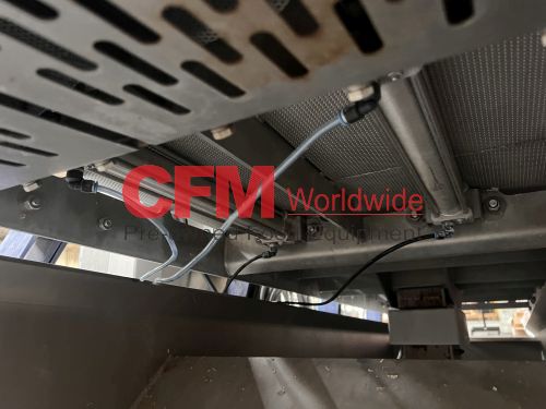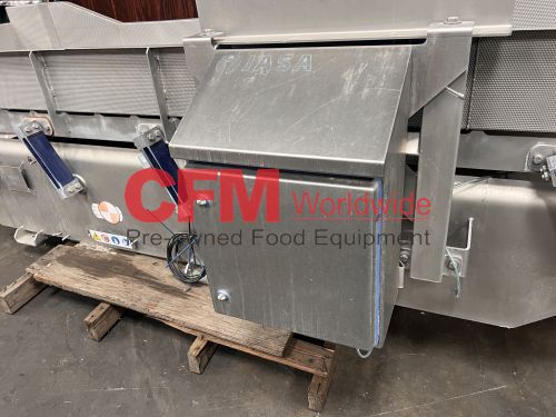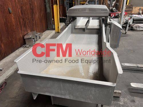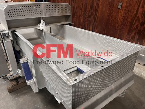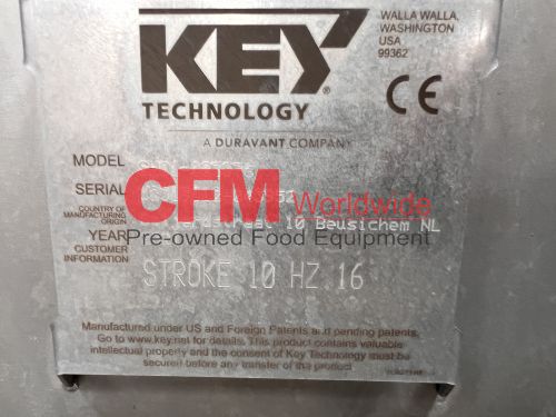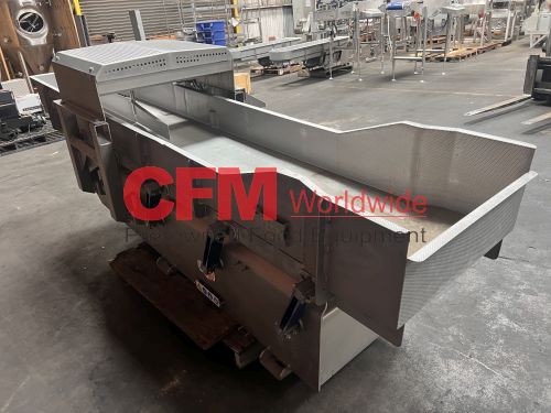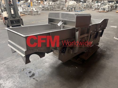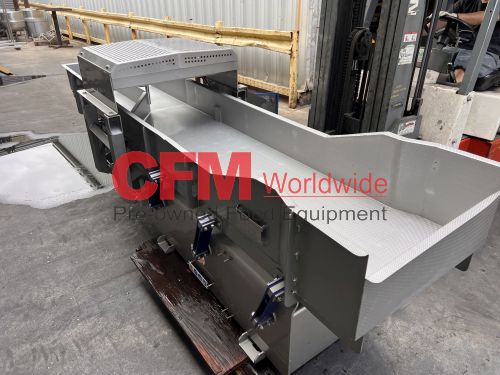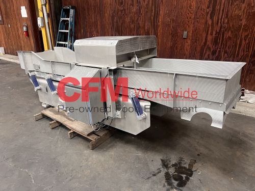 Key 24" wide x 10'8" long distribution shaker, 6" tall sides, rigidized surfaces, air actuated center mounted diversion gate to (2) 12" wide lanes, each lane feeds to a 12" wide x 9" long bottom discharge hoppers with air actuated bottom gates, with air controls, powered by a Reo Reovib AC magnetic vibrator, model WI 421/18/6.50, 400v all stainless steel construction, model SH01-103876, serial number W2019112-043952, 2021, as is – very good condition.