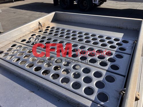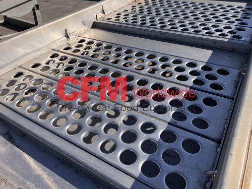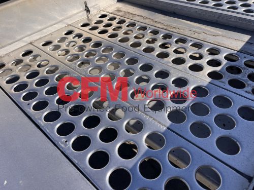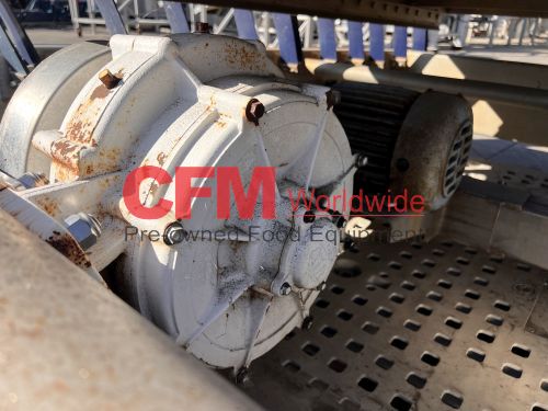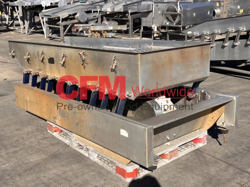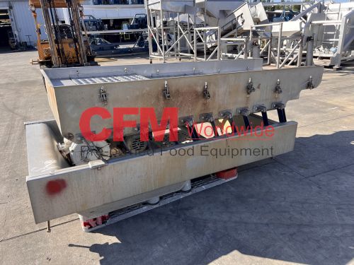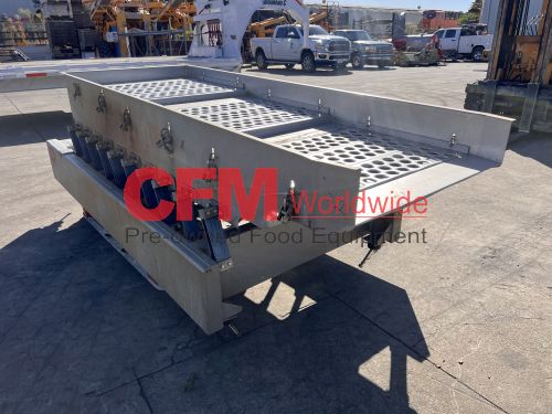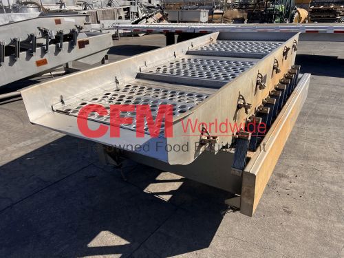 Key 36" wide x 8'6" long stainless steel dewatering/sizing shaker, set up with (3) 36" wide x 24" long screens with 1-3/4" round holes, with Ajax eccentric and a 2hp drive, 230/460/3/60, requires rubber bushing mounts and sub-frame, as is, good condition.