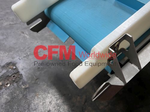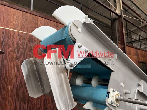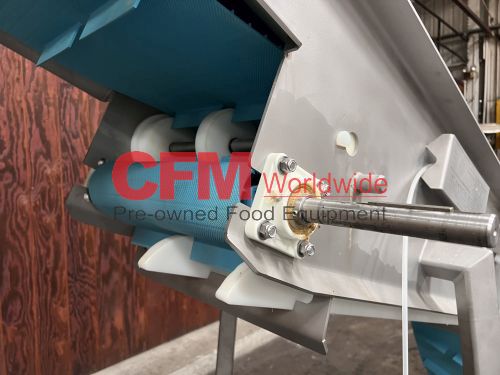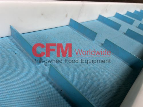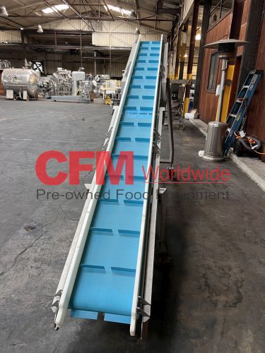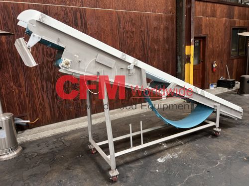 Nelson Metals 16" wide x 14' long sanitary belt elevator, all stainless steel construction, 1.5" flights on 10" centers, 80" discharge height, no drive motor, on casters, serial number 24051, as is, good condition.