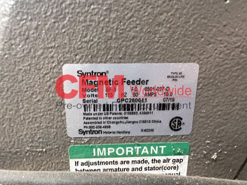 Syntron model BF-3 magnetic feeder, 115/1/60, 10 amps, serial number GPC260641, 2019, stainless steel construction, requires feed pan, as is – new condition.