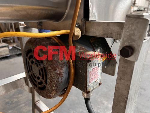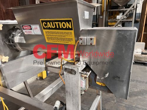Urschel model 3600 Comitrol processor, screw fed with hopper infeed, 1/2hp screw drive, set up with a 3" cutting head, part number 66831, 10hp 3505rpm drive motor with brake, stainless steel contact and frame, as is, fair to good condition.