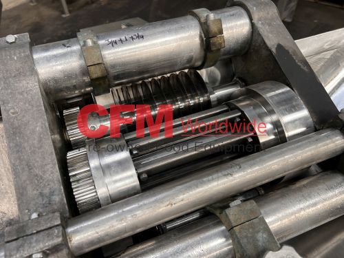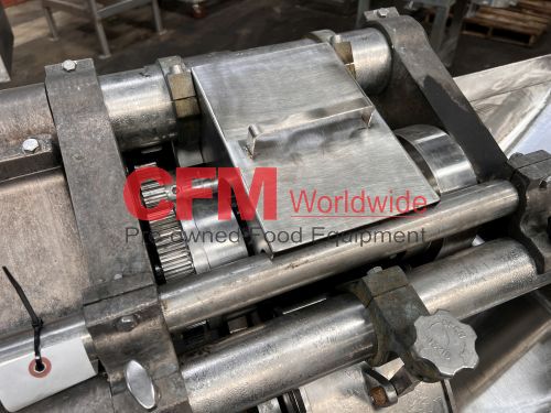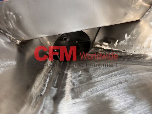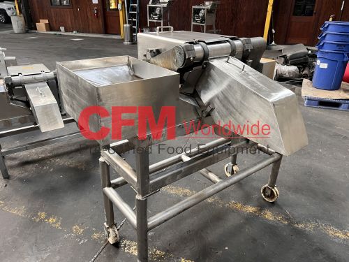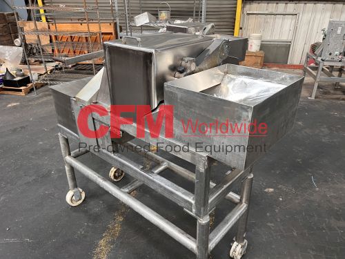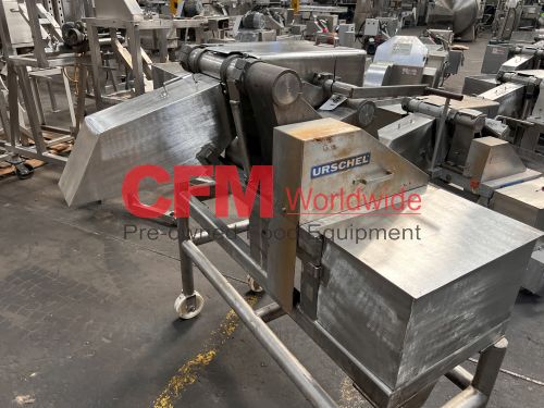 Urschel model H dicer, all stainless steel contact and frame construction, hopper infeed, small diameter impeller, set up for 1/2" x 3/4" x 3/4" cut, with drive, with all standard guards and discharge chute, no serial number, with control panel, as is - good condition.