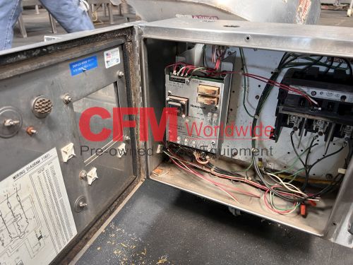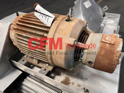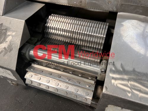Urschel model J dicer, set up with a 1/4" feed roll, a 1/2" circular cut spindle and a 7-blade crosscut spindle, standard belt infeed, with discharge chute and drive guard, 5hp 230/460/3/60 belt drive with brake, with control panel, all stainless steel contact and frame construction, serial number 1082, as is, good condition.