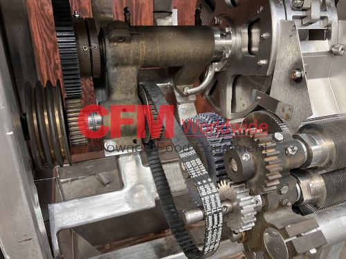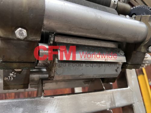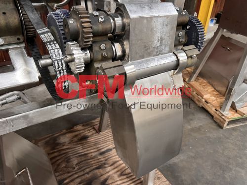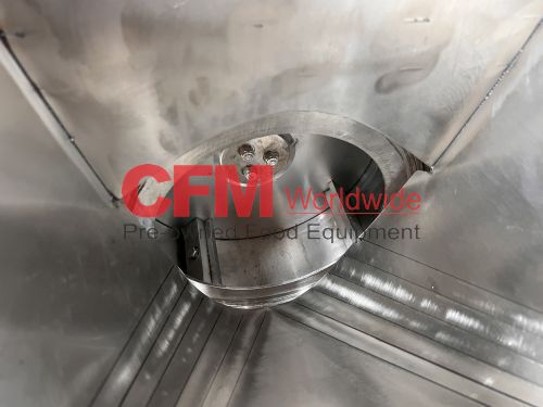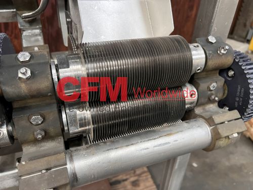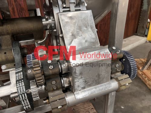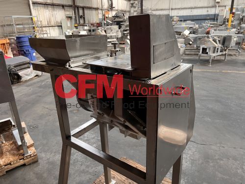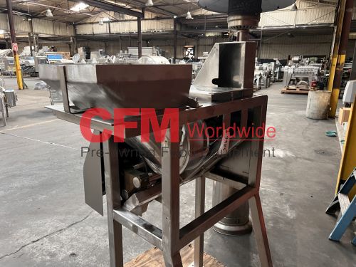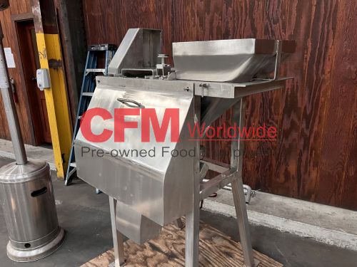 Urschel model RA dicer, all stainless steel contact and frame construction, hopper infeed, set up for 1/8" x 1/8" x 1/8" cut, with drive, with all standard guards and discharge chute, no serial number, with control panel, requires drive kit completion, as is - good condition.