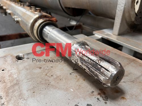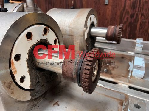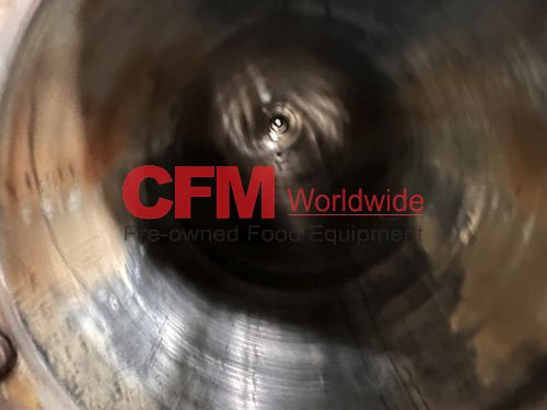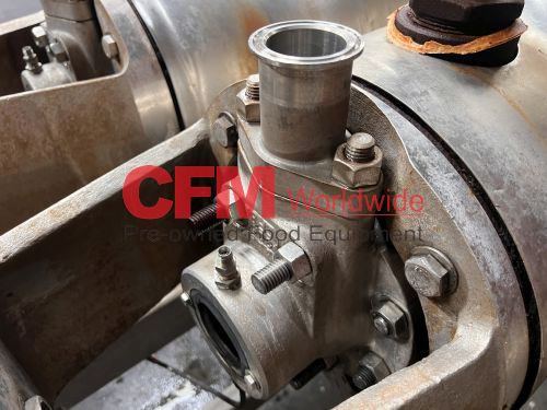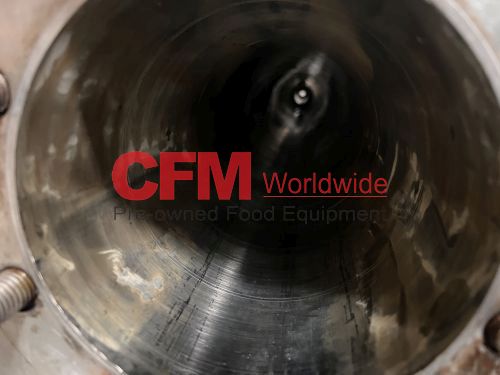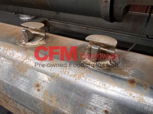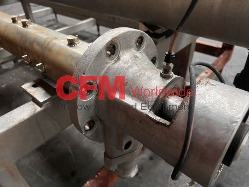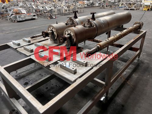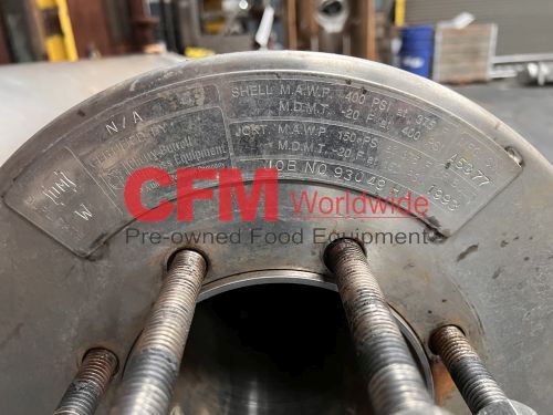 Votator (Cherry-Burrell) dual 6" x 72" swept surface heat exchangers, each with 9 square feet of surface area, 2" Tri-Clamp fittings, no drives, mounted on a factory built stainless steel frame for four units, model 4C672, serial number 93049HA, barrels have their own serial numbers, A5374 and A5377, 1993, fair condition, as is.
