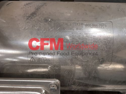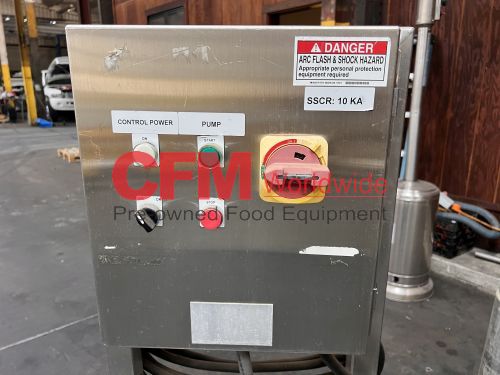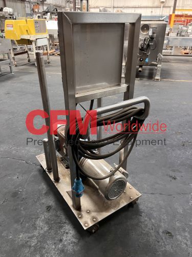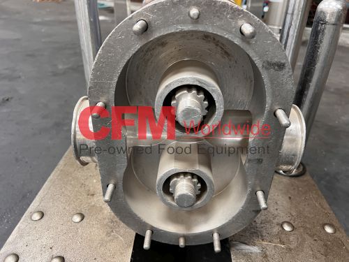 Waukesha model 130 positive displacement pump, 3" Tri-Clamp fittings, 5hp stainless steel direct gearhead drive with Waukesha gearbox, stainless steel mobile cart with control panel, missing face plate and rotors, serial number 412511-06, as is, fair condition.
