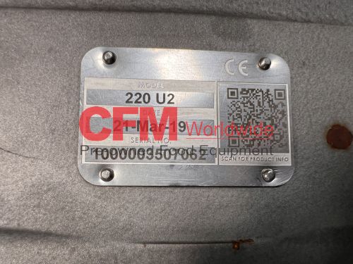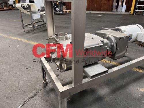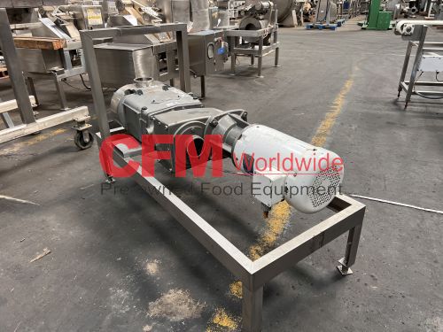 Waukesha model 220-U2 4" positive displacement pump, horizontal mount with a 7.5hp direct coupled gearhead drive, 1770rpm with a 26.25:1 gearbox, 67rpm output, 230/460/3/60, Tri-Clover fittings, stainless steel base, requires faceplate, .004" rotors, as is, very good condition.