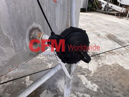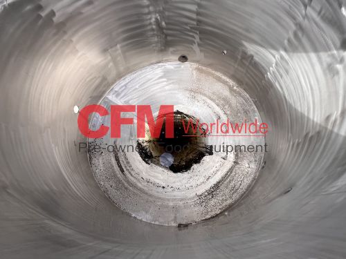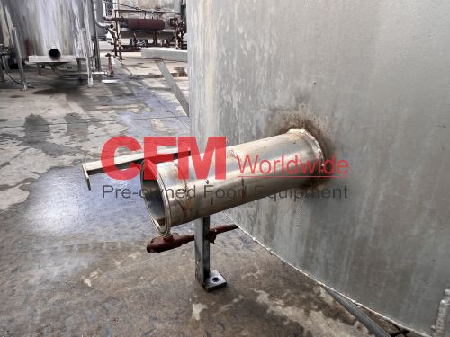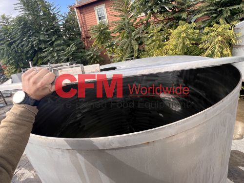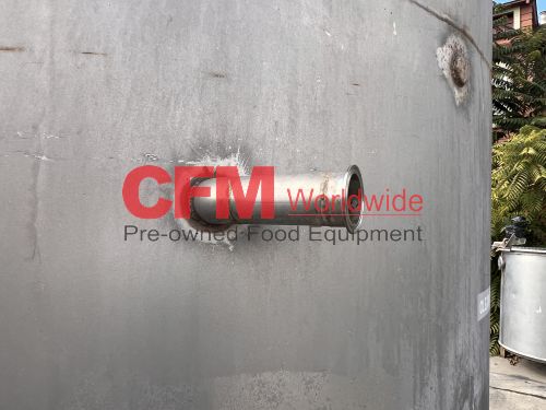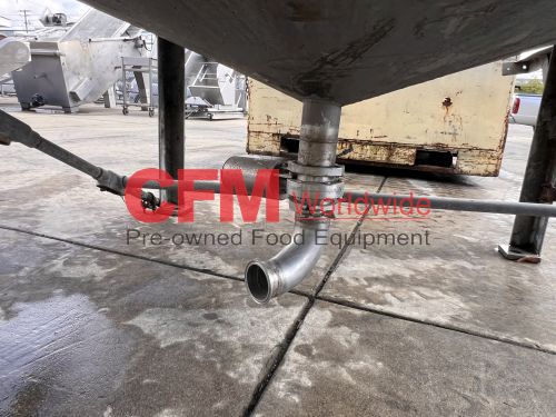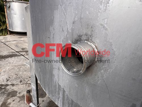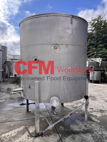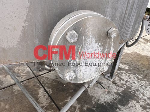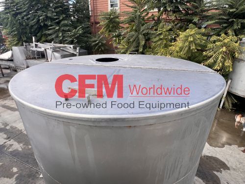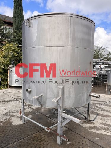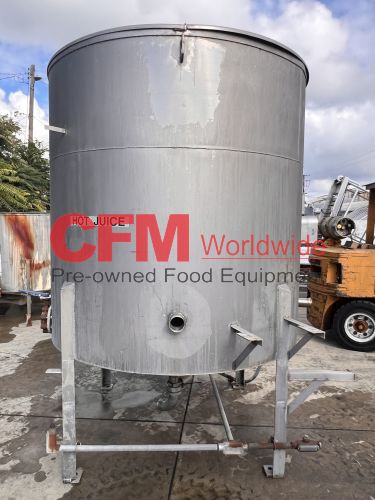 1200 gallon stainless steel vertical tank, 72" diameter x 72" tall, hinged cover, sloped bottom, 1) 4" side infeed, 2) 3" side infeeds, 3" center bottom discharge, stainless steel legs, 102" high, as is, fair condition.
