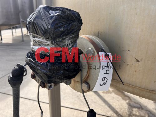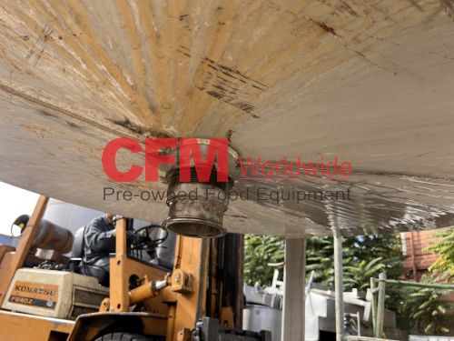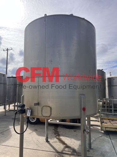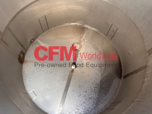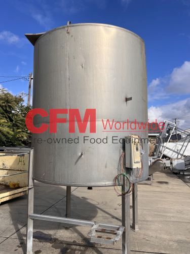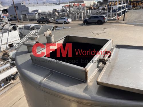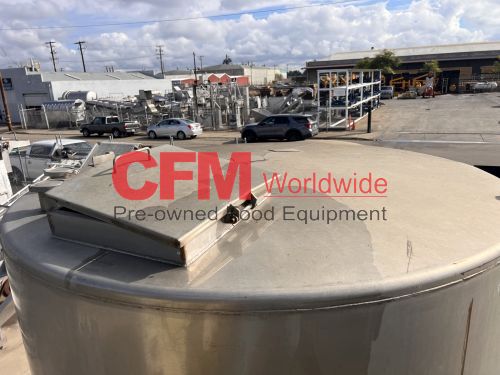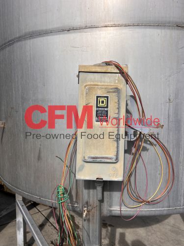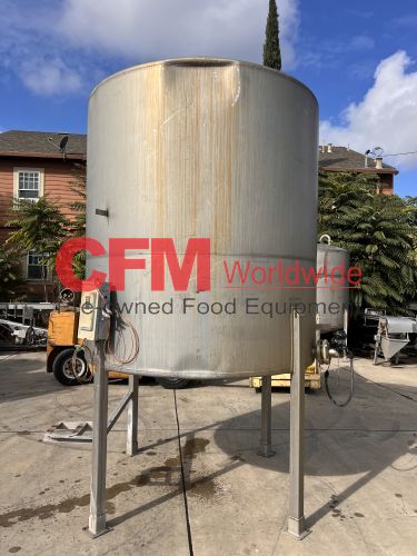 1400 gallon stainless steel vertical tank, 74" diameter x 80" tall, covered top with manhole, sloped bottom, 2) 3" top infeeds, 3" center bottom discharge, stainless steel legs, 124" tall, as is – good condition.