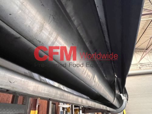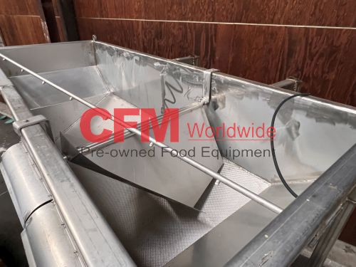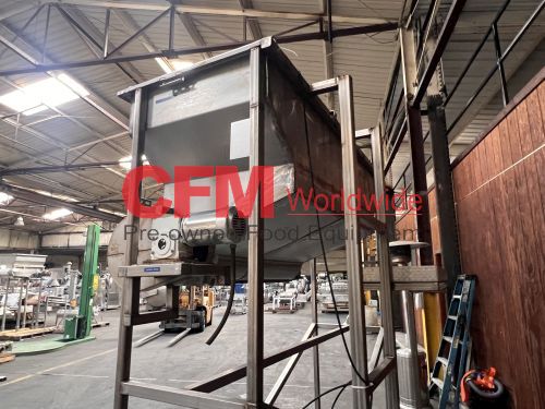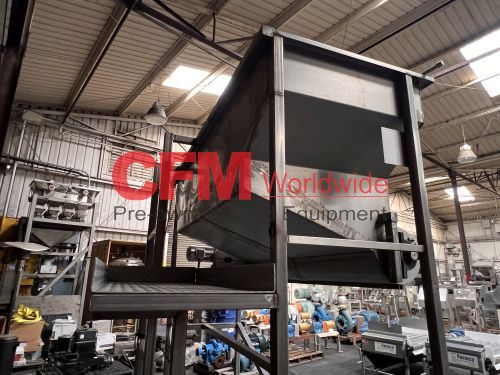 32" wide x 8' long x 32" deep stainless steel feed hopper with a 12" diameter x 6' long rotary metering valve, with catwalk, with a 2hp gearhead chain drive, 9' high infeed , 6' high discharge, as is – good condition.