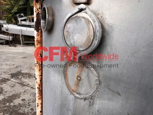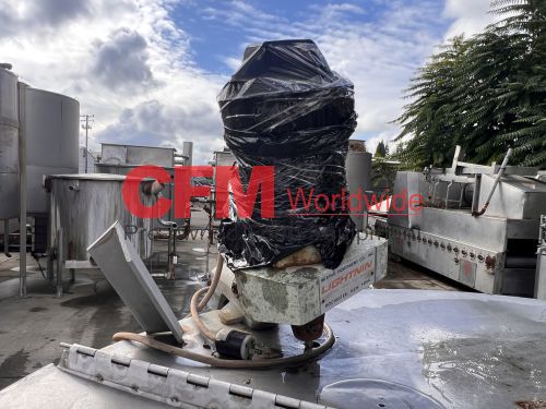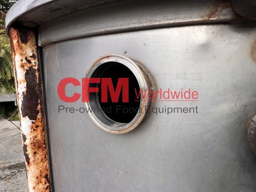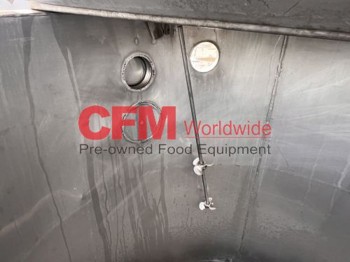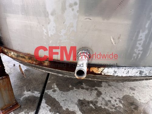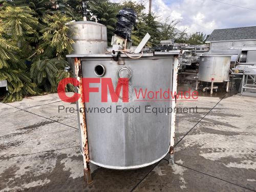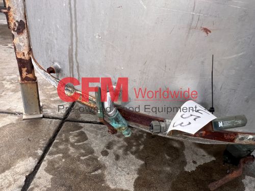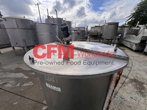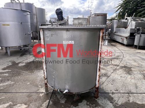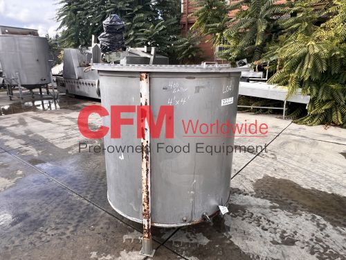 400 gallon stainless steel vertical tank, 48" diameter x 50" tall, hinged cover, flat bottom, 2" bottom discharge, mild steel legs, with a broken Lightnin' mixer, as is, fair condition.