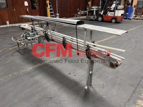 4.5" wide x 11' long stainless steel table top conveyor, plastic belting, 3/4hp gearhead chain drive, belting with top mounted hood, as is – fair to good condition.