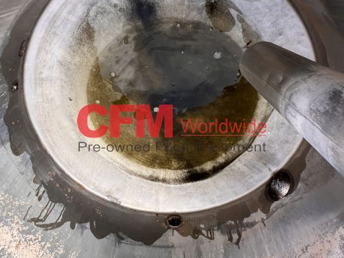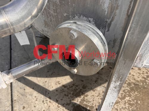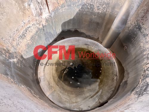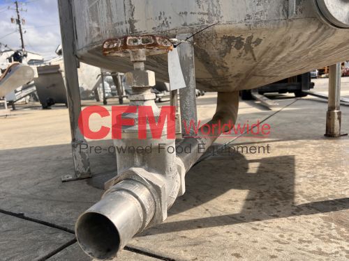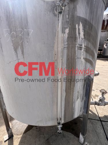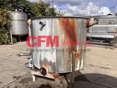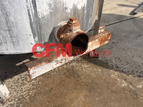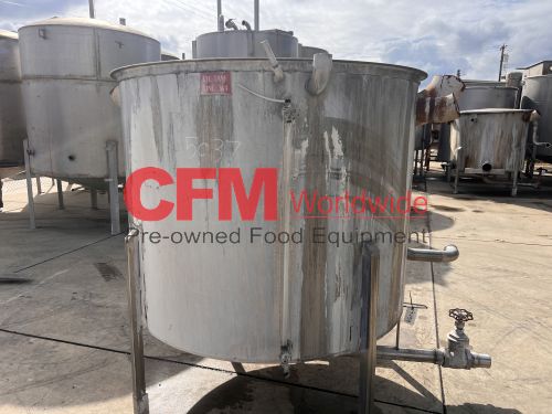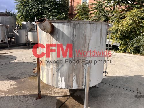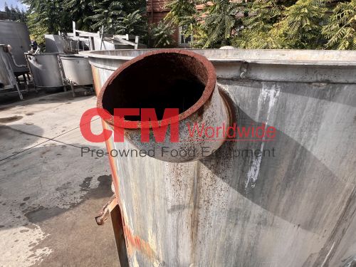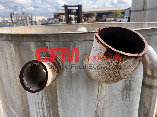 500 gallon stainless steel open top vertical tank, 60" diameter x 48" tall, 4) 6" mild steel infeeds, 4" center bottom discharge, stainless steel legs, tank has a lot of scale built up, as is – poor condition.