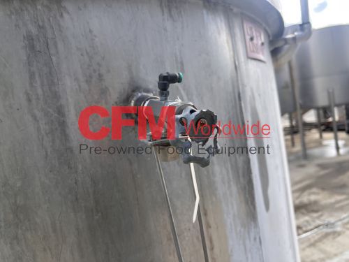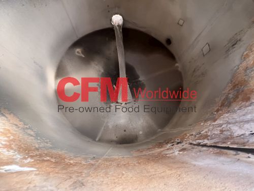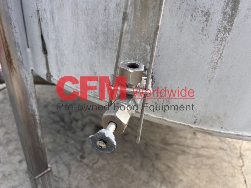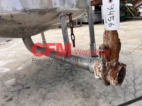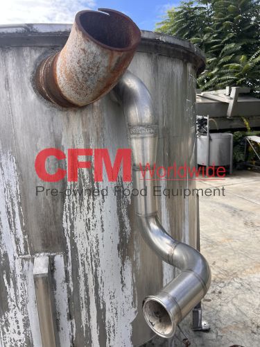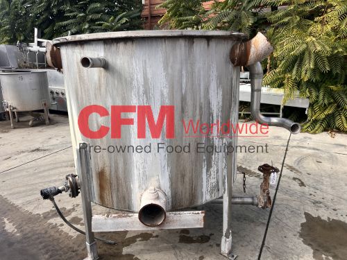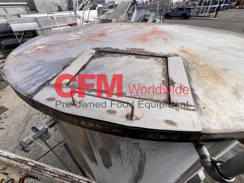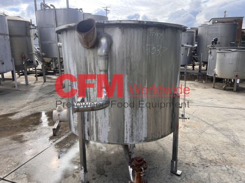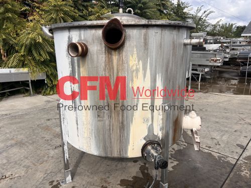 500 gallon stainless steel vertical tank, 60" diameter x 48" tall, with lid, 4) 6" mild steel infeeds, 2) 2" infeeds, 1) 3" infeed, 3" center bottom discharge, stainless steel legs, tank has a lot of scale built up, as is – fair condition.