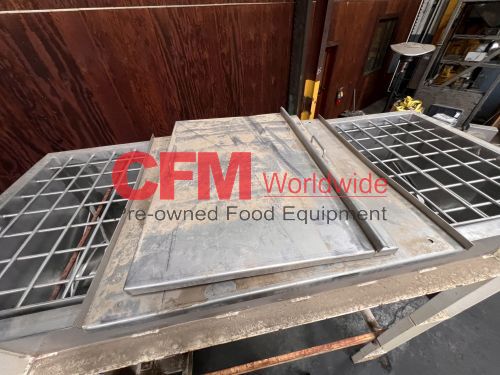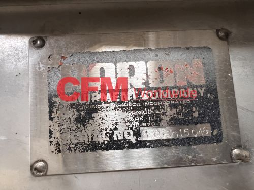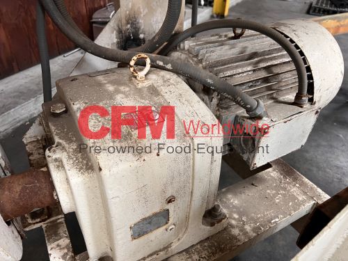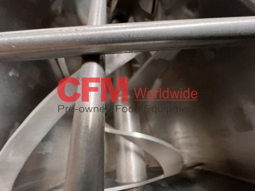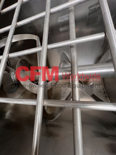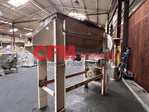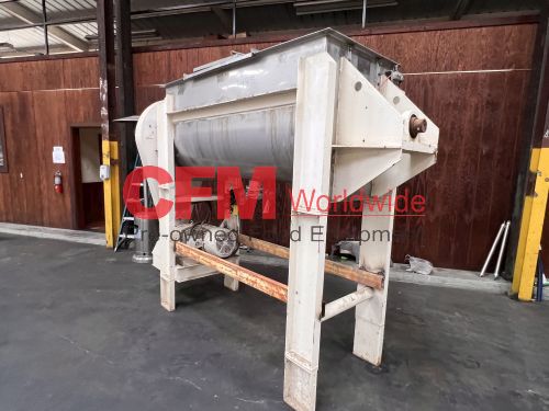 Aaron Equipment Company 40 cubic foot stainless steel ribbon blender with top safety grid and removable covers, 6" center bottom discharge, 30" wide x 78" long x 32" deep, stainless steel contact, mild steel support frame, 15hp gearhead chain drive, serial number 93036015046, need to confirm motor specifications, as is, good condition.