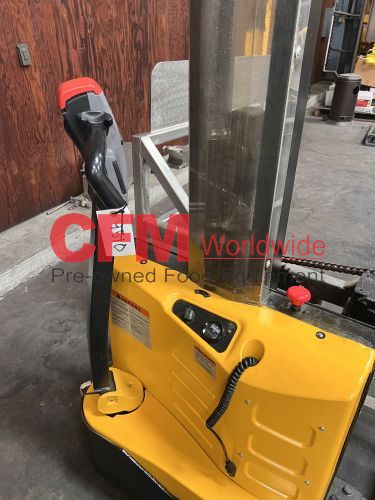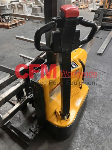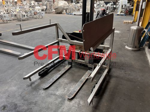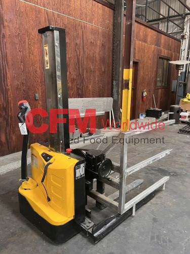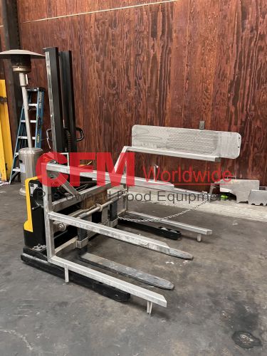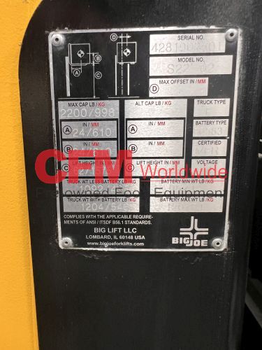 Big Lift "Big Joe" model S22-62 fully powered straddle stacker with full tote side tilt capabilities, 2200 pound capacity, 62" maximum lift, hand operated tilt with a 46" wide stainless steel tote support frame, 42" long forks on 20" fixed center, with (2)12v / E0583 batteries, serial number 4281902601, will not start – batteries may need replacing, as is, good condition.