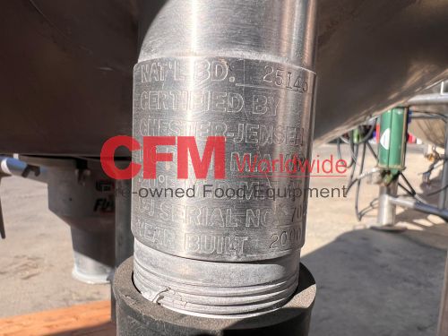 Chester-Jensen 70 gallon double motion swept surface cooker-cooler (kettle), model 70N2.5, 100psi jacket, 36" diameter x 16" tall with a 6" tall cone bottom, hinged covers, water jacketed, single motion swept surface agitation driven by dual 1hp stainless steel drive motors, 230/460/3/60, 3" center bottom discharge with a manual ball valve discharge, all stainless steel contact, bridge and frame construction, serial numbers 70025 and 0314-P, 2003, National Board Number 25145, as is, very good condition.