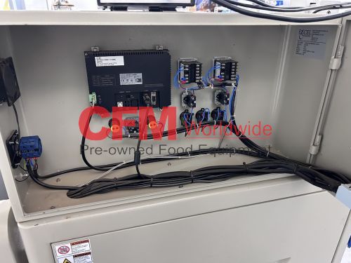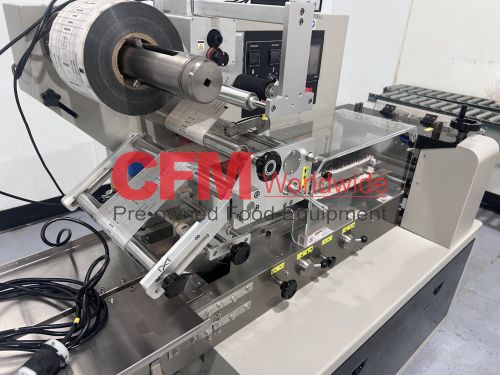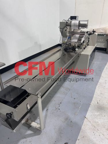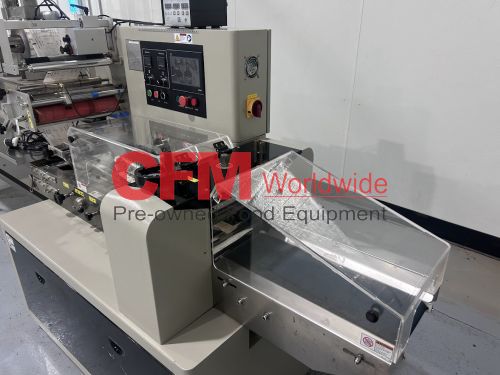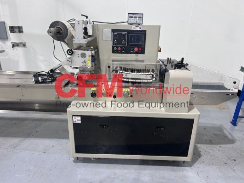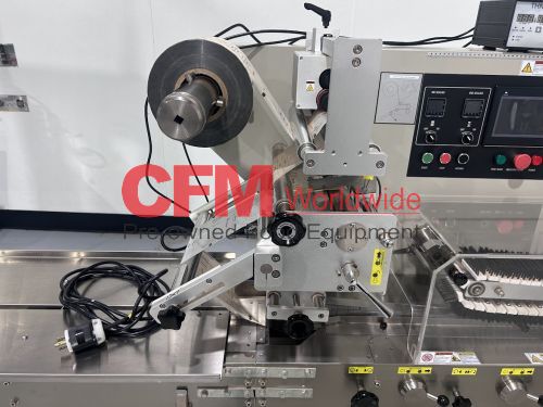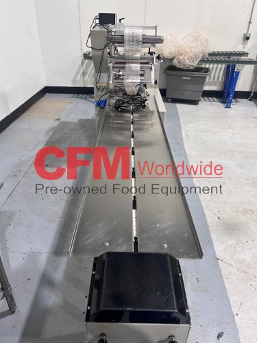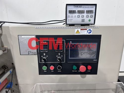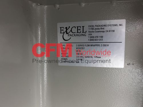 Excel Packaging C-Series model C-350H Horizontal Flow Wrapper, 4.3" seal jaw width, 9.8" maximum film width, 2.25" x 1.25" minimum package dimensions, 7.25" x 4.25" x 1.5" maximum dimensions, equipped with a THK-10A ink roll coder, touch screen controls, 220/3/60, 10 amps, serial number M552351, new in 2019, as is, very good condition, FOB Northern California.