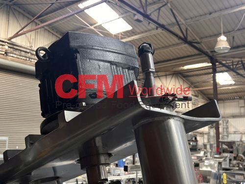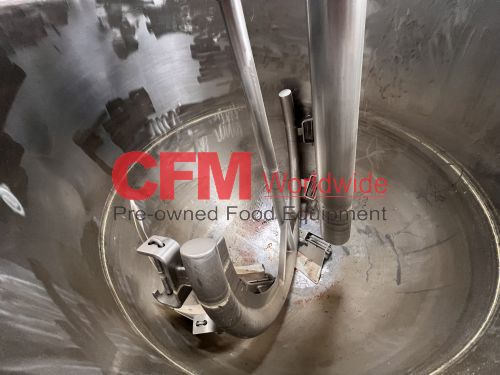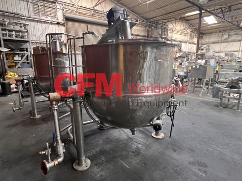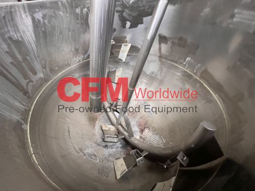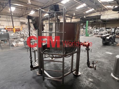 Groen 250 gallon single motion swept surface kettle, model D/INA/2/TA-250, 45PSI steam jacket, angle mounted agitation with gearhead drive (requires motor), requires the hydraulic cylinder for agitation tilt out, kettle has a hydraulic cylinder for tilting and has Deublin steam joints, 4"center bottom discharge with a Flowserve ball valve, unit includes an operator platform, all stainless steel contact, bridge and frame construction, with hydraulic controls, serial number 02600-2, National Board Number 140224, manufactured in 1999 and altered by Groen in 2016, as is, good condition.