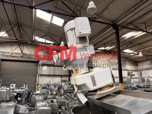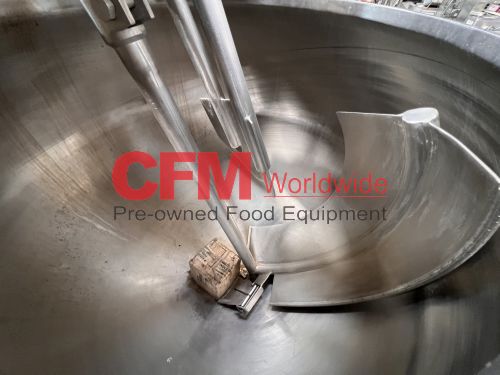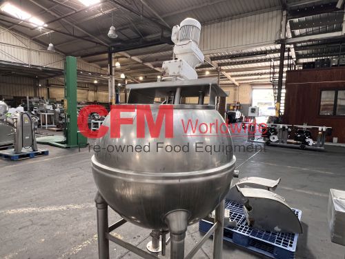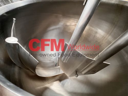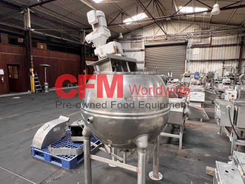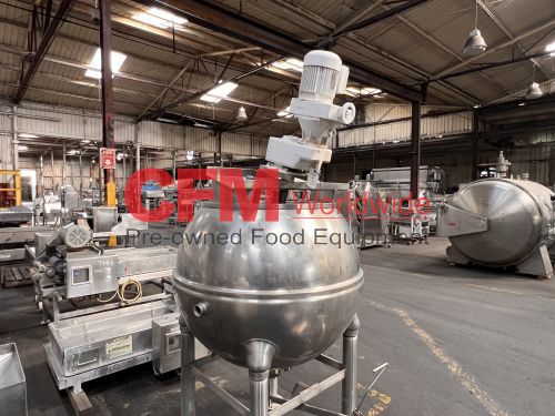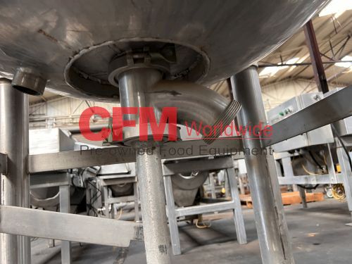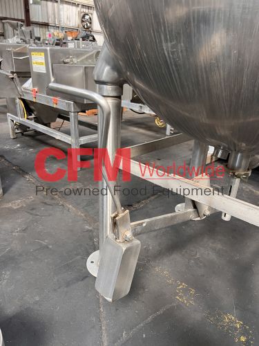 Groen model INA-150 spherical single motion agitated kettle, 100psi steam jacket, tilted agitation with a bottom scraper over the 3" center bottom discharge, with plow, with manual discharge valve, agitator driven by a 1.5hp SEW variable speed drive, 230/460/3/60, 316 stainless steel contact, stainless steel legs and bridge, 1986, serial number 129250, as is, good condition.