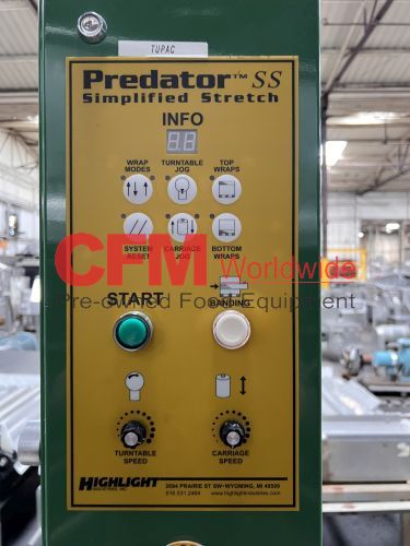 Highlight 'Preditor SS Simplified Stretch' model H-1675 semi-automatic pallet stretch wrapper, will handle single high and double high pallets up to 110", with stretch tension adjustment, with controls for turntable and film head speeds and wrap pattern, with forklift ports for easy moving, 115/1/60, wraps up to 20 loads per hour, as is, good condition. Unit is offered new on Uline.