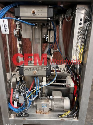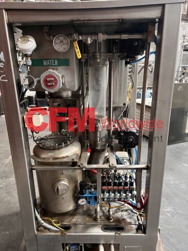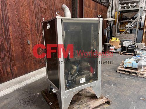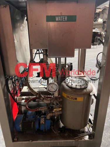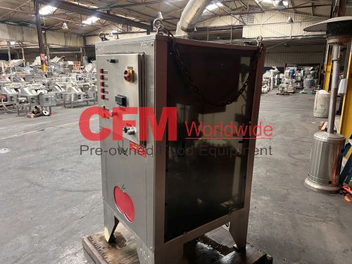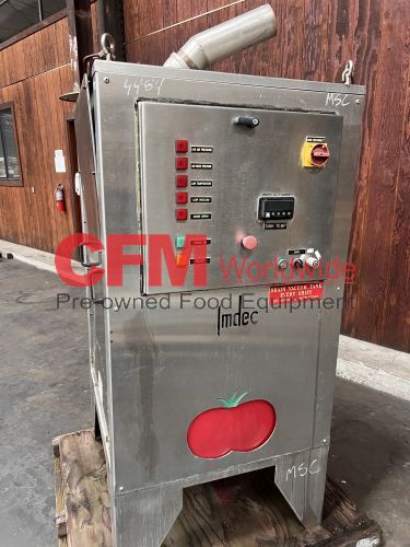 Imdec batch steam peeler for tomatoes, scaled for R&D/Laboratory studies, with glass peeling chamber, hot water tank with electric heater, Travaini vacuum pump and vacuum tank, isolation valves and a small u-shaped pinch bed, with controls, stainless steel enclosure with removable Plexiglas sides, fair to good condition, as is.