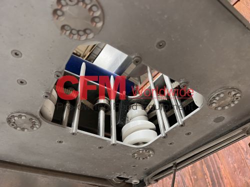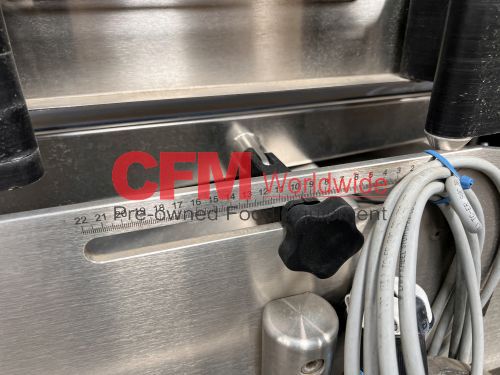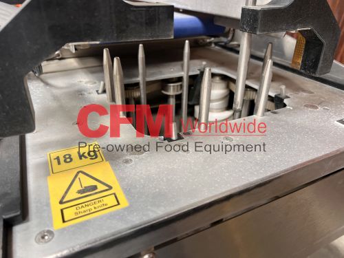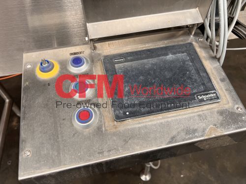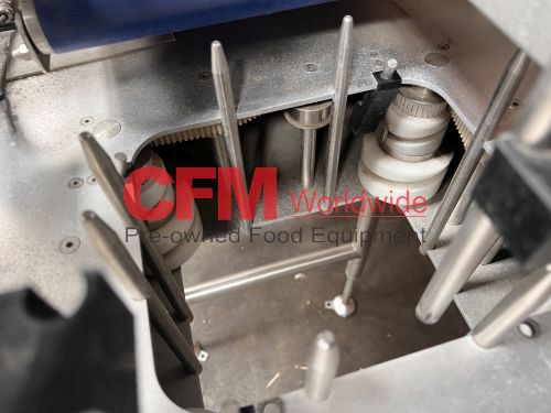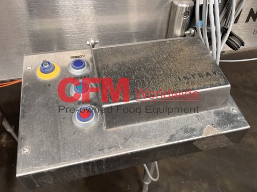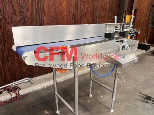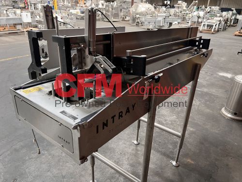 Intech Intray clamshell denester, set up with a Smart Tool head for 7.5" x 9" salad trays, 11" wide x 64" long feed belt, with controls, all stainless steel contact and frame construction, Smart Tool number 90003173, P11781-2.0A, as is – very good condition.