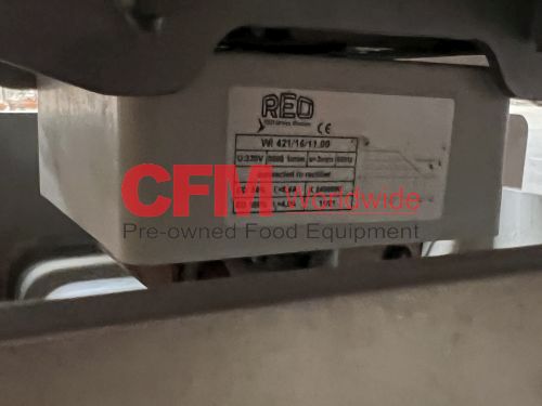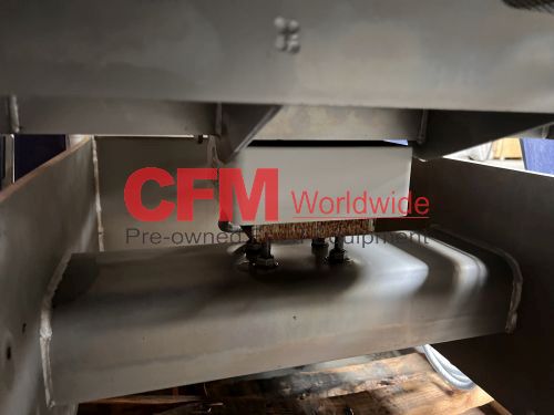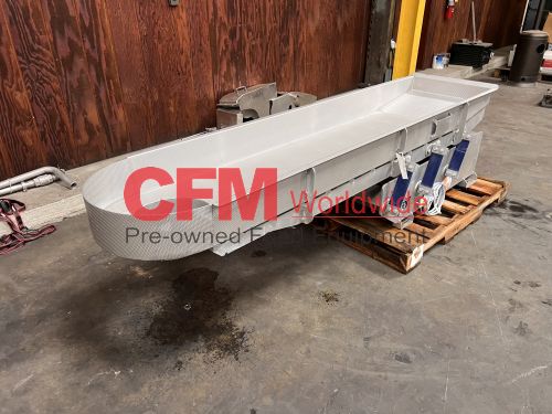 Key 20" wide x 88" long vibratory scale feeder with a 12" diameter circular discharge, 6" sides, rigidized surfaces, powered by a Reo Reovib AC magnet vibrator, model WI 421/16/11.00, 230v, all stainless steel construction, model SH01-103877, serial number W2019110-43950, 2021, as I – very good condition.