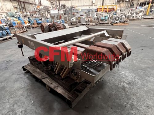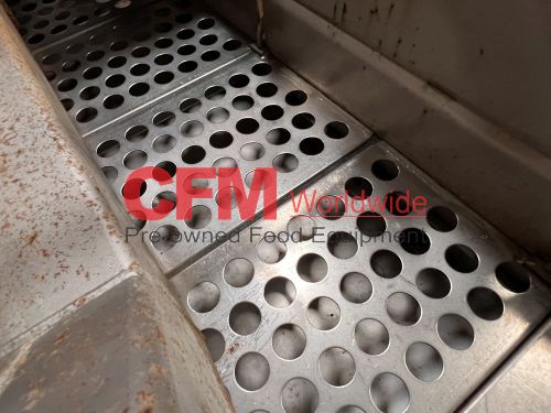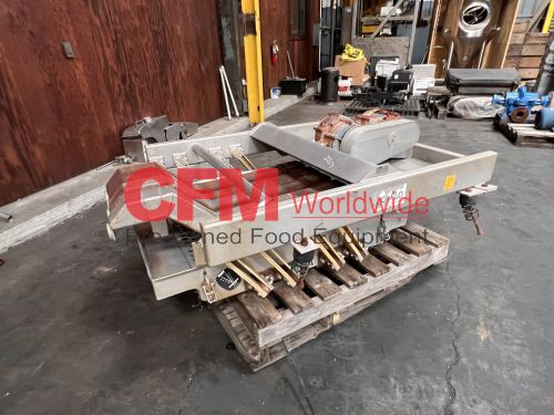 Key 34" wide x 48" long stainless steel pit removal shaker, screen with 1-1/8" round holes, overhead mounted Ajax drive kit, 1hp belt drive, 230/460/3/60, mild steel support legs, as is, fair condition.