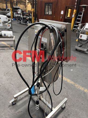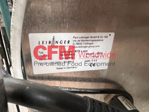 Leibinger JET3+pro ink jet printer, on a stainless steel portable stand, single print head, stainless steel control cabinet, 110/240/1/50/60, serial number LJ-306878, as is, fair to good condition.