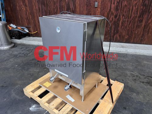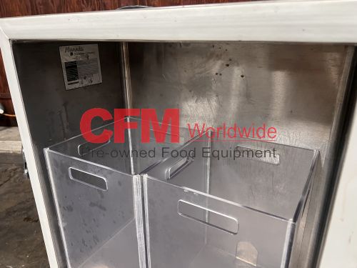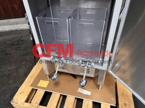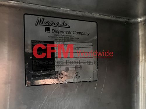 Norris model N10MNS twin head milk dispenser/beverage cooler, for use with bags or bag-in-boxes, with (2) 6 gallon plastic bag crates and (1) spare, all stainless steel construction, 115/1/60, 401A refrigerant, as is, good condition.
