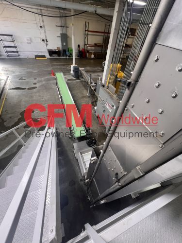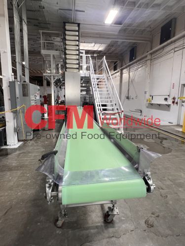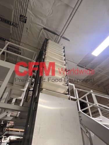 5) 16" wide flighted belt take-away conveyor, 3'6" long infeed, 5' long rise, 2' long discharge, all stainless steel construction Intralox belting with 2" flights on 6" centers, with drive
