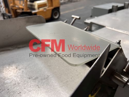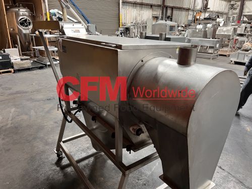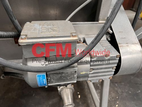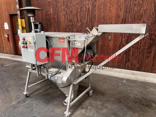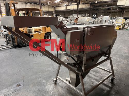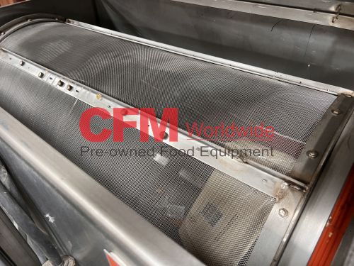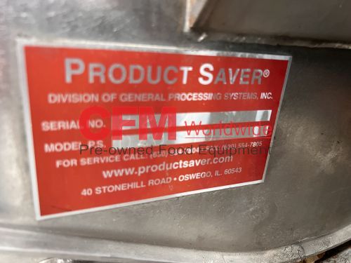 Product Saver model PS341 product reclamation system, all stainless steel construction, 4" x 10" feed chute with product feed table, 18" diameter x 36" long rotary drum with wire mesh screen, with product catchpan and package discharge hopper, 1/2hp knife drive and a 3/4hp drum drive, 230/460/3/60, mounted on casters, serial number 2263, as is, very good condition.