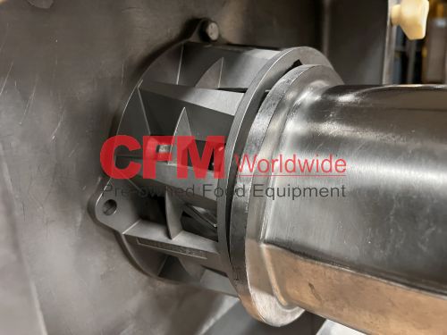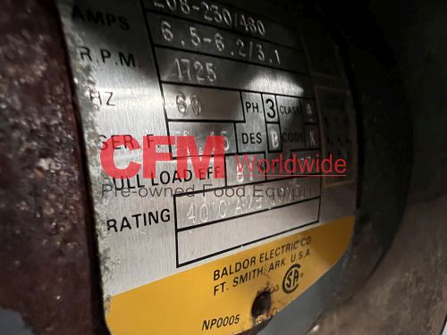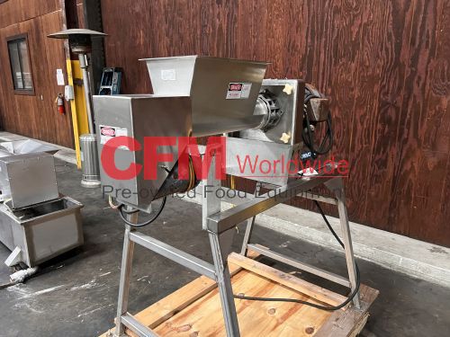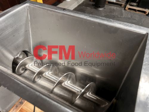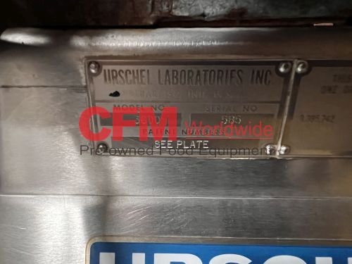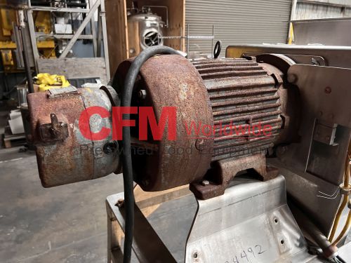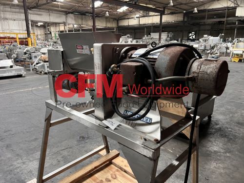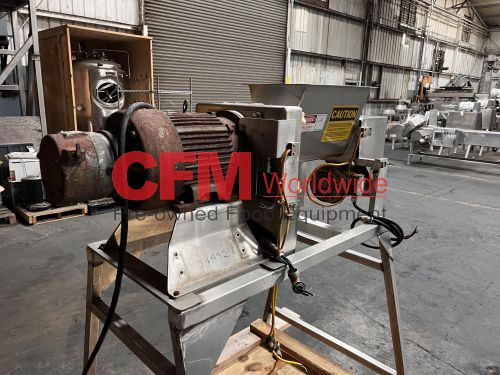 Urschel model 3600 Comitrol processor, screw fed with hopper infeed, 1/2hp screw drive, set up with a 3" cutting head, part number 66831, 10hp 3505rpm drive motor with brake, stainless steel contact and frame, as is, fair to good condition.