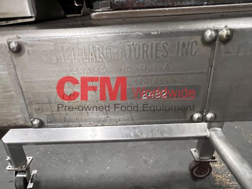 Urschel model CC slicer, stainless steel and bronze contact parts, 2hp belt drive, 230/460/3/60, bronze impeller and drive housing, bronze cutting head set up for v-style cuts, knife part number 22077, with feed hopper, top guard and bottom guard, serial number 2482, good condition, as is. *CFM has stainless steel & bronze V-cut, crinkle cut and straight cut heads in stock.