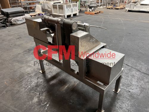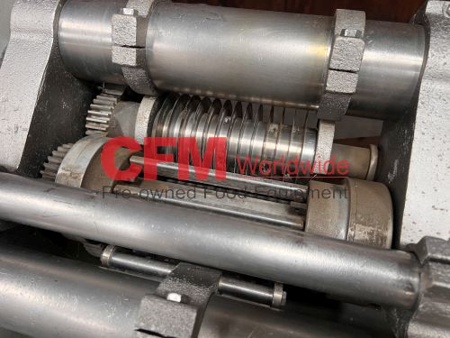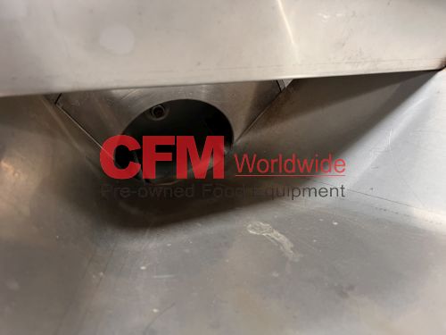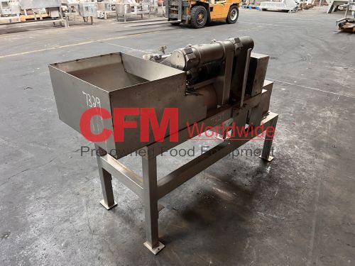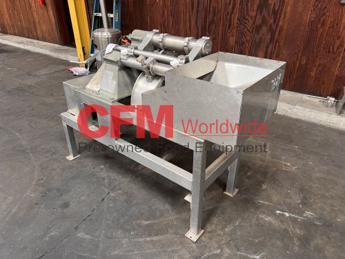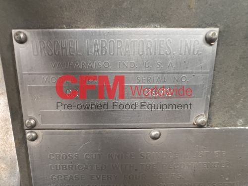 Urschel model GK dicer, hopper infeed, small impeller opening, 1/2" dice, missing top cover and discharge chute, 2hp belt drive, 230/460/3/60, all stainless steel contact and frame construction, serial number 2672, as is, good condition.