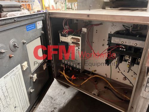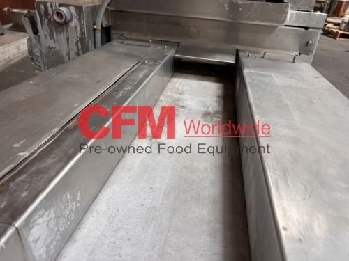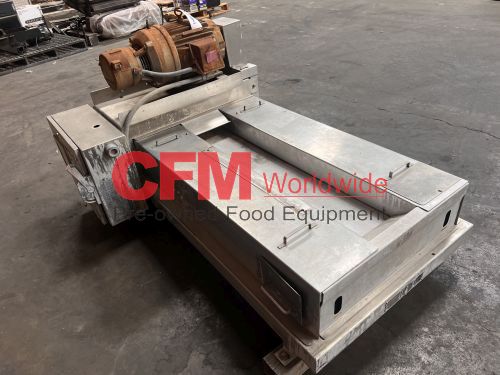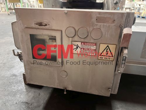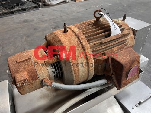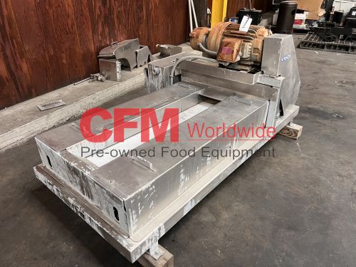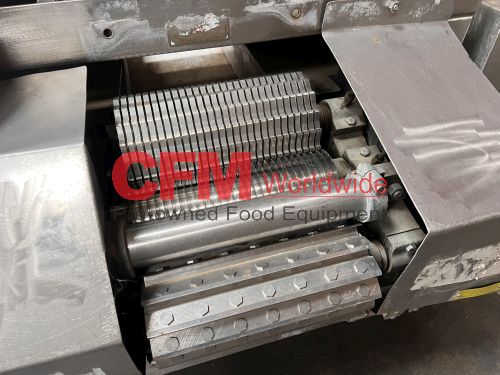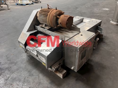 Urschel model J dicer, set up for 3/8" x 3/8" cut, belt infeed, 3?8" feed roll, 10hp belt drive with brake, 230/460/3/60, stainless steel contact and frame construction, missing discharge chute, serial number 1081, as is, good condition.