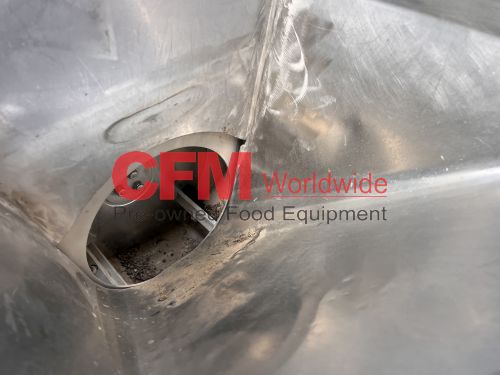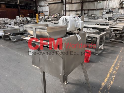 Urschel model RA-A dicer, set up for a 1/2" dice with a 2-blade crosscut spindle, hopper infeed, with front guard, discharge chute, chip guard and drive guard, 5hp 230/460/3/60 belt drive, on casters, serial number 1295, all stainless steel contact and frame construction, as is, good condition.
